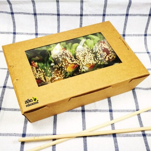 ตอนนี้ทั่วโลกกำลังลดการใช้พลาสติก เพราะพลาสติกกลายเป็นขยะในทะเลเยอะมาก ทำให้สัตว์ทะเลตายเพราะกินพลาสติกเข้าไป เราจึงเลือกใช้กล่องกระดาษคราฟท์ที่มีพลาสติกเล็กน้อยตรงช่องหน้าต่างด้านบนให้พอเห็นว่าอาหารภายในกล่องมีหน้าตาเป็นยังไง แพ็คเกจจิ้งเมนูนี้ประกอบด้วย